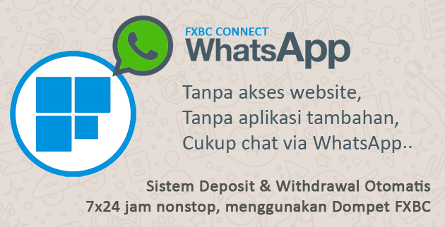 Untuk mendukung kemudahan Anda dalam bertransaksi, hari ini FXBC kembali meluncurkan layanan terbaru kami, yaitu [b]FXBC connect WhatsApp[/b], dengan hadirnya layanan ini Anda tidak perlu lagi repot2 untuk membuka website atau menginstall aplikasi tambahan dari kami.. Cukup menggunakan aplikasi WhatsApp yang biasanya sudah terinstall secara standart di handphone, Anda bisa menikmati layanan ini.
